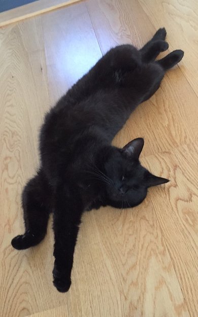 Izzy er helt svart. Noen få hvite hår på halsen. Hun har et barbert parti øverst på halen, men dette er omtrent utvokst igjen.