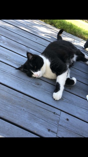 Svart hale og hode/rygg, hvitt bryst/hals og buk. Tofargede flekkete framføtter og bak hvite nederst