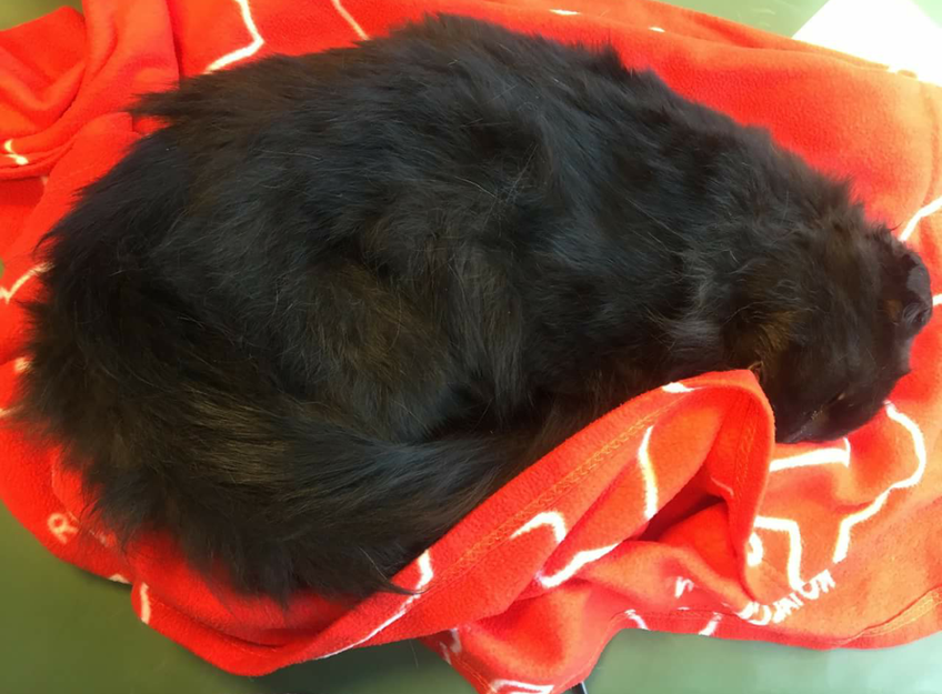 Den veier 5.5 kg, er helt svart og langhåret. Har litt hvit pels på brystet, svarte tær. Vi klarte ikke å lokalisere noen chip.