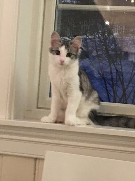 Katten er ung, bare 6 mnd. Den har en buskete hale, med en liten knekk ytterst. Den har en svart flekk på bakbeinet.