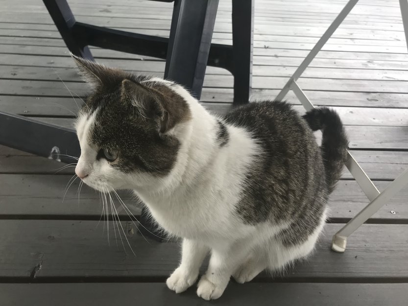 Meget kjælen katt har besøkt oss flere dager på rad. Virker ikke som den har et hjem.