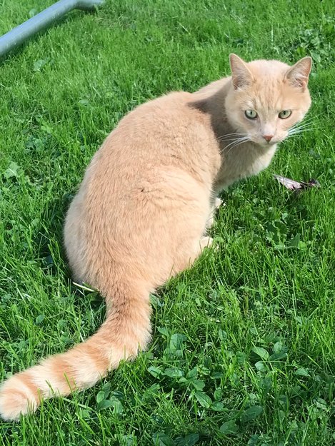 Oransjegul med liten hvit flekk på brystet. Stripete hale. 3 år gammel kastrert hannkatt.