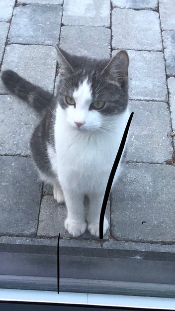 I går kom det en nydelig, men tynn katt og mhauet sårt utenfor døren vår. Den har bandasje på venstre bakken og en M (?) tatovert i øret.