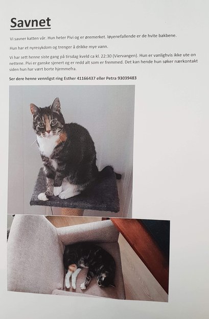Pivi har flyttet sammen med oss til Ask. Hun gikk ut og kom ikke inn igjen. Hun kan bevege seg mot Skedsmokorset -Korsfjellet der hun bodde før.
