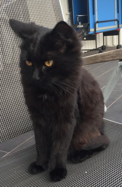 Hun er sterilisert og har en flekk med litt kortere pels på den ene siden bak mot lårbeinet (tror det er venstre side), der er pelsen litt brunere enn ren sort.
