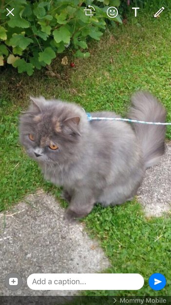 Bella er en inne katt og ikke vant til å være mye ute. Hun har blitt frisert så pelsen er ikke så lang akkurat nå. Hennes hale er bustete meg langt hår. Hun er grå farget.