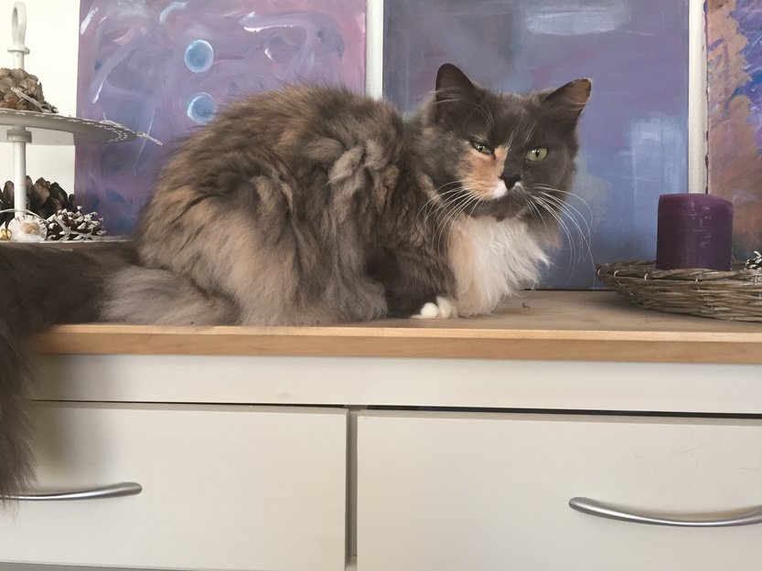 Brun/ grå langhåret jente- katt. Hvit på halsen foran. En firkant i brun ved/under det høyre øyet.