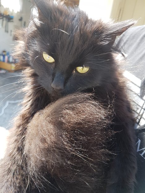 Katten er semilanghåret med noen få hvite hår på brystet.