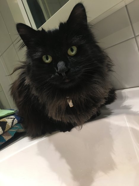 Hun er helt sort, med en anelse av brune sjatteringer rundt kragen og på sidene. Langhåret.