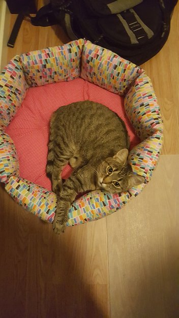 Ho e kvit under haka, og brun på mageområdet. Ho har svart/mørke stripe. Lita frøken på snart 6 år.