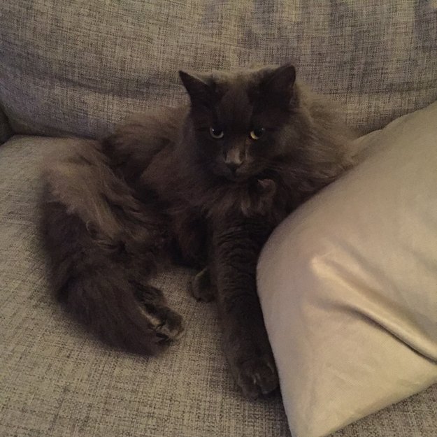 Han er stor og har superbuskete vakker hale. Max er veldig engstelig for fremmende, særlig menn. Når han er redd løper han langflat og gjemmer seg. Han er veldig snill og kosete når han har tillit. Vi savner han allerede.