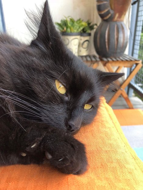 Fluffy myk pels og "ekornhale" meget sosial, stryker seg inntil og maler søtt, også til fremmede. Liker ikke å bli løftet. Hun har litt klumper i pelsen v rompa. Dyktig jeger og hopper høyt. Hun er 6 år gammel.