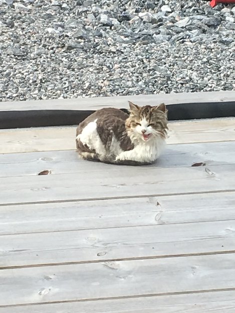 Katten har begynte plutselig å bo i bislaget vårt og er her fortsatt. Den er liten og redd så vi kommer ikkje i nærheten. Det ser ut som den har blitt klipt og dermed tenker eg at det må være noen som eier katten.
