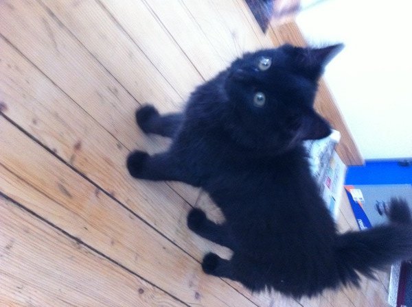 Sort, liten hunnkatt, med noen få hvite hår i pelsen. Den er tillitsfull, leken, kosete og ser ut til å være vant til å omgås mennesker.