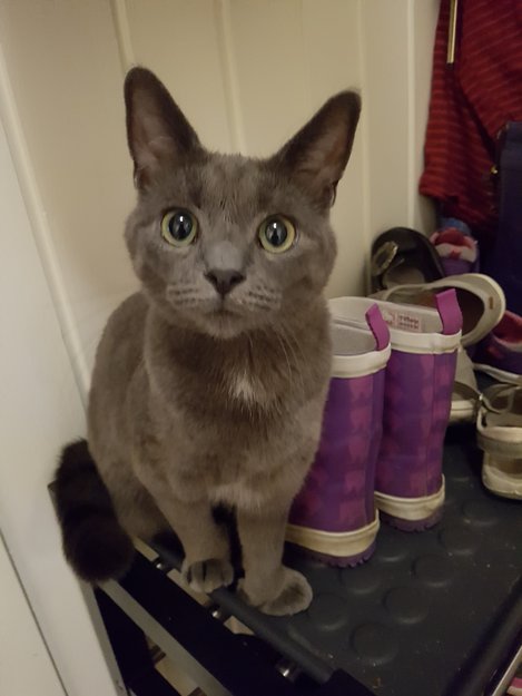 Ca. 1 år gammel, liten av vekst. Grå. Liten bitteliten flekk hvit på brystet. Skipskatt med store labber..