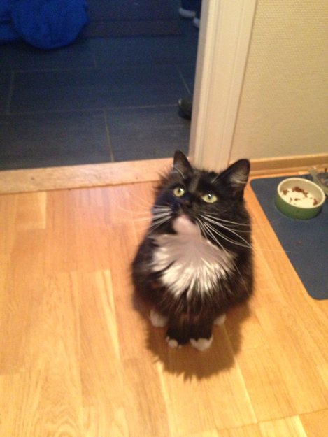 Katten kom hjem, sto plutselig på trappa og venta på oss, skrubbsulten og litt bustete i pelsen