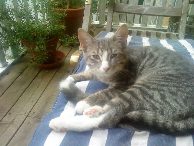 Flott ung hannkatt, muligens en blanding siden den har ganske spisst fjes, grå makrell stripet, har lang hale med hvit hale tipp..Veldig kosete og menneskekjær, men sider vi har 2stk katter fra før så går det ikke bra..Lengter hjem..