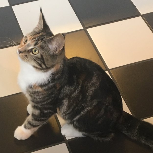 Stripet ung hunnkatt: sort/grå/litt oransje med hvitt bryst, mage og poter. Små dusker på ørene. Hun er 1 år og 3 mnd gammel. Tillitsfull og nysgjerrig. Kommer gjerne og hilser når hun blir ropt på.