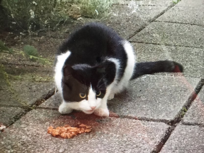 Ser ut som en ung hannkatt, sort og hvit. Den har hengt rundt her i flere dager. Virker mer og mer sulten. Tror ikke den finner veien hjem. Litt skvetten, men tam.