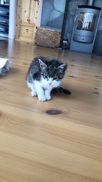 Grå, hvit og svart katt ble funnet i Frøya