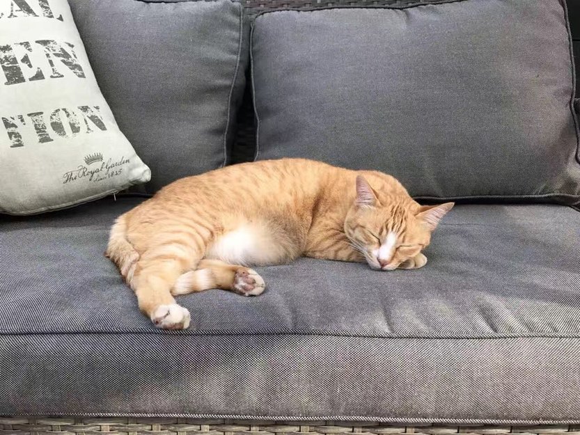 Hun er en orange stripet katt med hvit mage og grønne øyne.