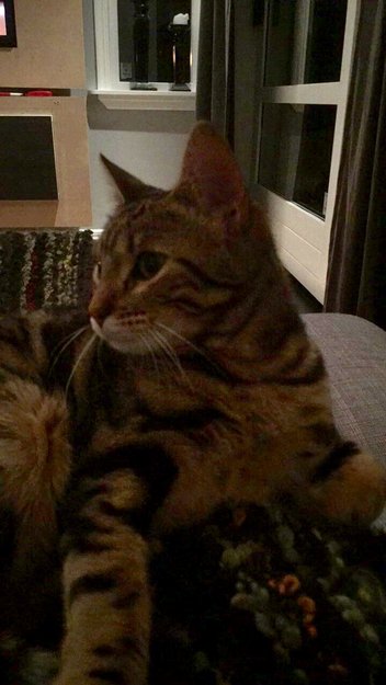Lizzie er halvt Bengal katt, tigerstripet i fargene beige, brun og svart.
