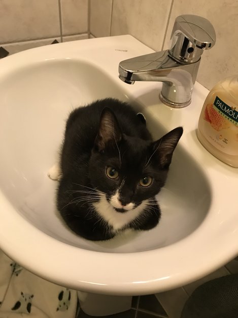 Katten er 8 mnd, veldig kosete og trygg. Har 4 hvite poter, noe hvitt på haletupp, brystet og hvit på høgre side av nesen.