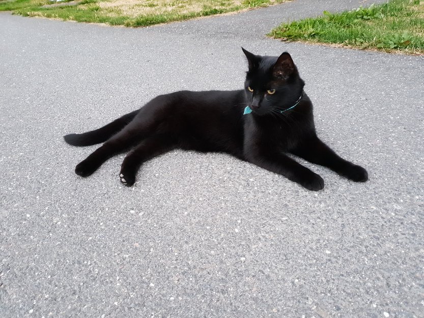 Har lyseblått halsbånd der navet hans og mitt står( mobilnr var det ikke plass til) Lyder navnet Bagera og legger seg ned om man sier skal vi kose.