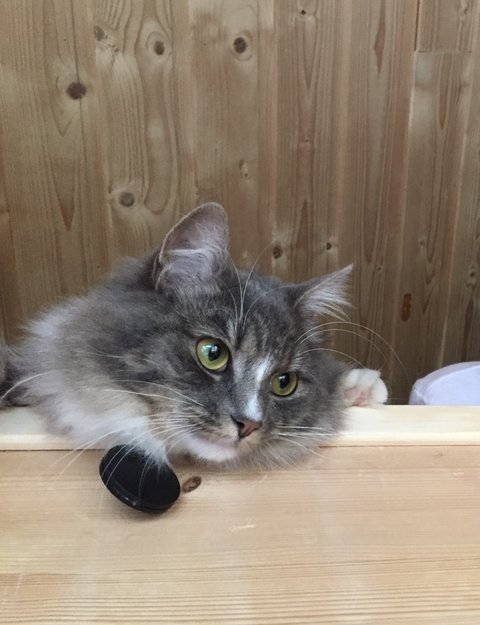 Langhåret, grå -mørkegrå. Hvit stripe på nesa, endel hvit pels under halsen. Hvite poter.