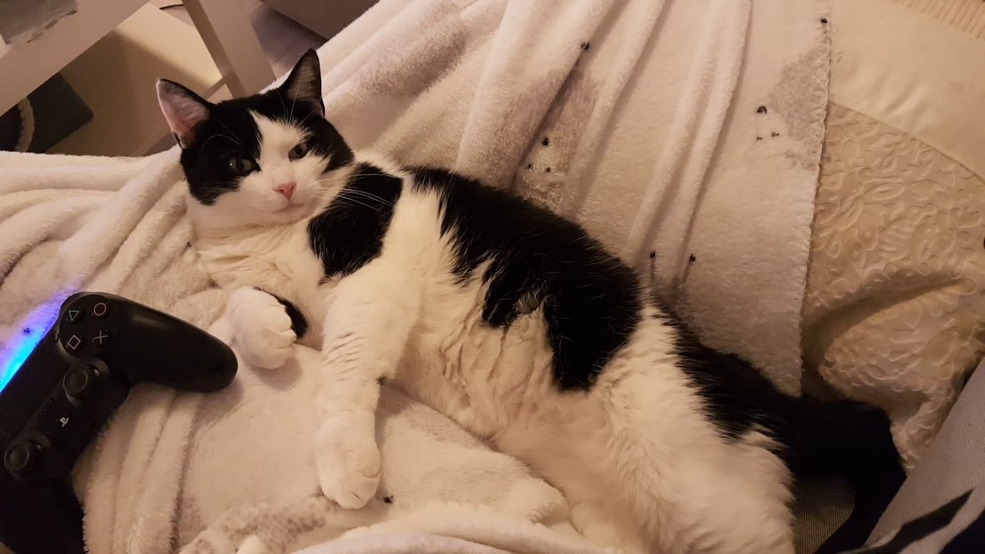 Hun er hvit på undersiden av kroppen og mest svart på oversiden av kroppen. Hun har en spiss i ansiktet som går med pilen opp mot ørene(midt i mellom dem). Hvite poter, ikke så veldig høy, men litt "lubben" for størrelsen.