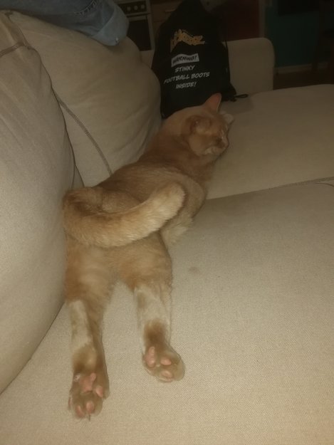 Har akkurat vært hos dyrlegen etter et katteslagsmål, så han har en del sår i ansiktet. Han har ganske store poter, for han er halvt bengaler. Han er også en katt som elsker å holde praten igang.Han er også chippet.