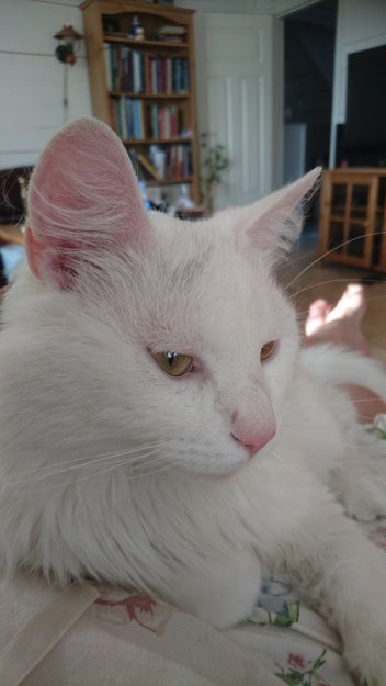 Han har to partier mellom ørene som man kan se litt grått. Har en kortere hale