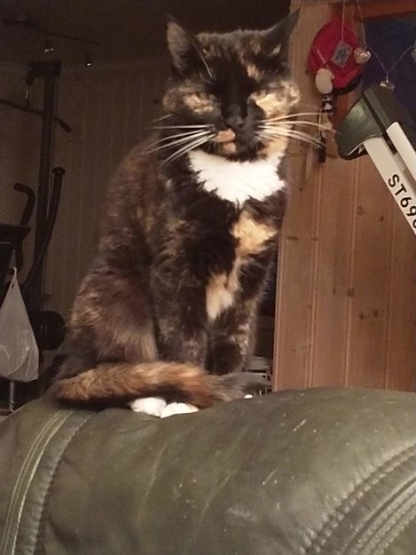 Hun er skillpaddefarget med hvit. Hun klarer ikke mjaue skikkelig som andre katter. Hun har en tattovering i øret som sier ID. Hun er skeptisk til både lyder og mennesker, hun er veldig flink til å gjemme seg.