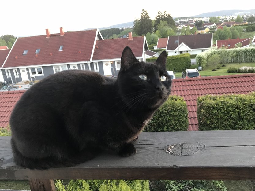 Noen få hvite hår foran på brystet. Grønne øyne. Relativt liten og nett.