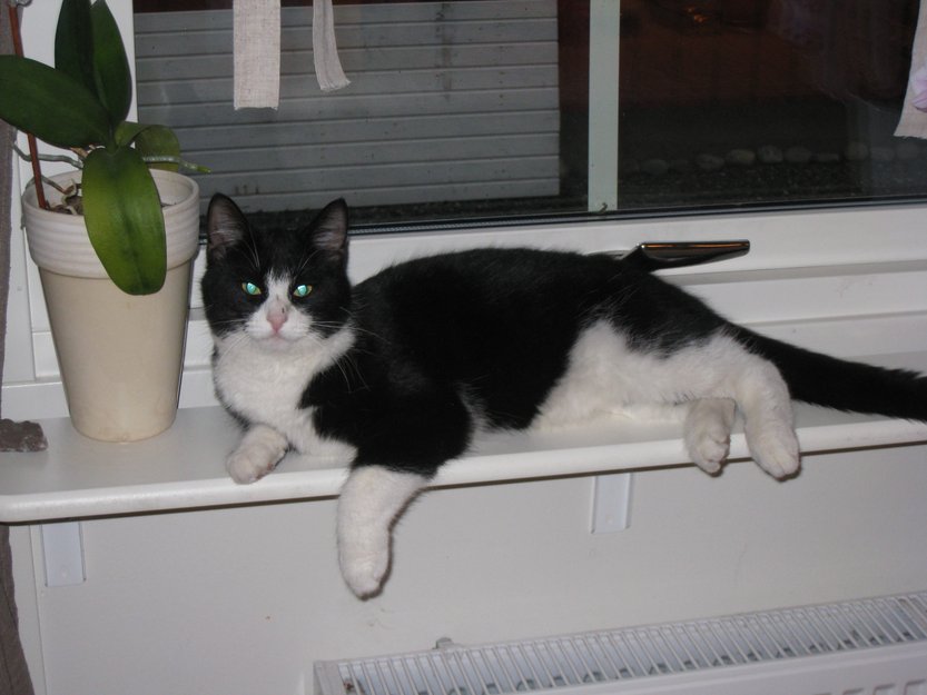 Sort på ryggen, endel hvitt under magen og på føttene. Sort og hvitt ansikt. Forsvant 1.juli. Pleier å komme hjem hver dag. Kan vært innestengt i garasjer, boder ol. når han er borte over flere dager. Han er en stor musefanger. Han er sosial og kosete. Fint hvis alle kan sjekke garasjene/bodene sine, hvis de ikke har vært åpnet på noen dager. Og også sjekke/lytte hos naboer hvis de har reist på ferie de siste dagene. Setter pris på all hjelp. Tusen takk.