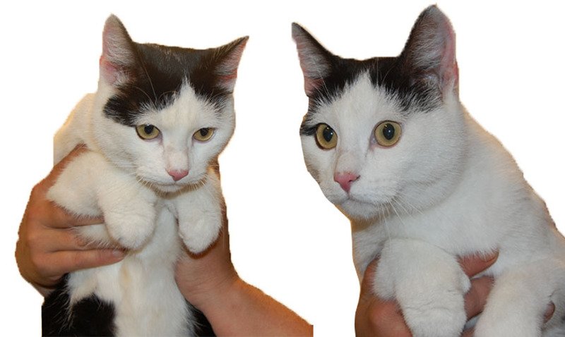 Skipskatt, hvit med sorte flekker. Liten hunnkatt. Markert sort ned ved hennes høyre øye.