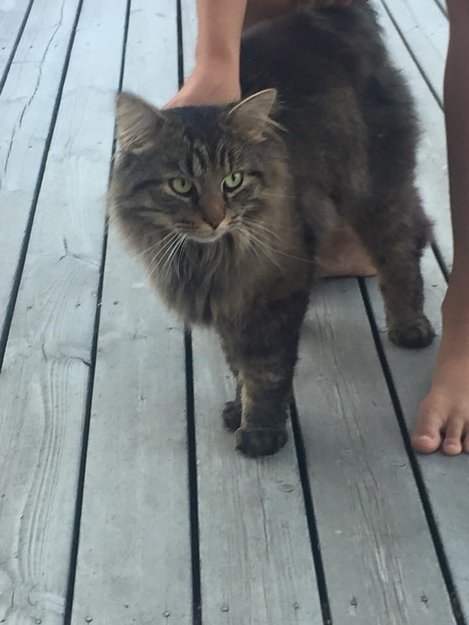 Katten er gråstripet, semilanghåret og veldig vakker. Hunn eller kastrert hann, tror vi. Den virker nokså ung, i alle fall ikke eldre enn 3-4 år. På tross av at den er svært tynn virker den frisk, selv om den kanskje har litt tynn pels i nakken, og virker å klø i det ene øret. Den har ikke chip.
