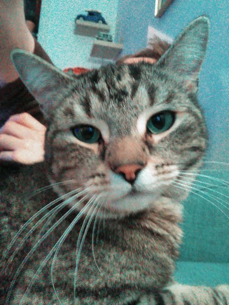 Er litt lengre i håret enn vanlige sånne katter. Prikker/flekker på magen, ellers en blanding av striper/skilpaddemønster.