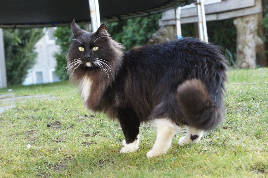 Stor svart og kvit hannkatt med eit hakk i kvart øre. Om lag 7 kilo, langhåra, manglar ei hjørnetann. Chippa. Kjælen, men sky.