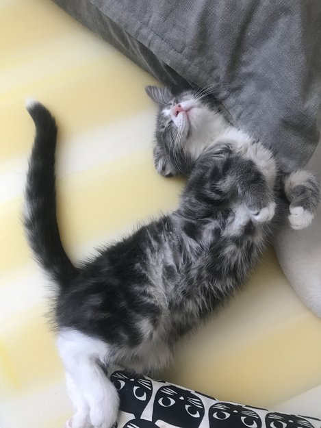 Hun er en ca. 13 uker gammel, og er hvit og grå. Hun er tricolor farge, ligner litt på tigerstriper.