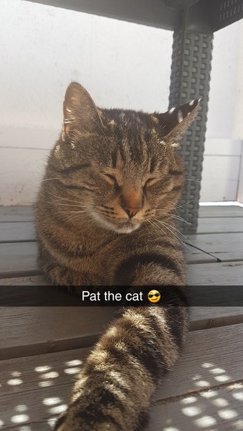 Pat er en veldig sosial hankatt som elsker både mennesker og hunder. Vi lever i håpet om at han har invitert seg selv på besøk hos noen. Han er veldig kosete og pratsom, og veldig glad i å gå på besøk til naboer om han får sjansen.