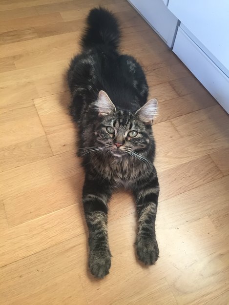 Spraglete mønster i sort/grått. Lange sorte fjon som står opp fra pelsen. Klarer ikke mjaue, men noen ganger kommer det små pip eller bare luft når hun åpner munnen. Er veldig leken og spretten. Løper fort. Har en gigantisk hale, både i lengde og bredde.