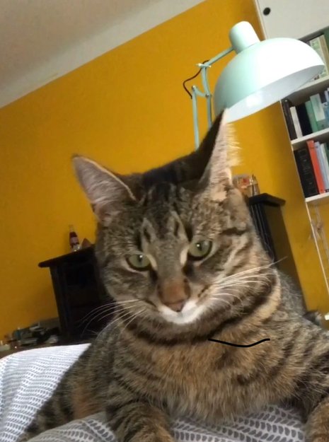Tigerstripet brungrå svart pels, og mer beige lys på magen, ganske varm i tonen. Hun er litt hvit rundt snuten. Halen hennes er litt rar der den noen ganger peker rett frem isteden for bare opp.