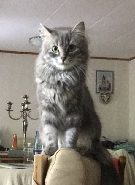 Slank hunnkatt, lang pels og hvite områder på magen og i ansiktet. Liker å fange og spise insekter. Maler sjeldent, liker å bli klødd.