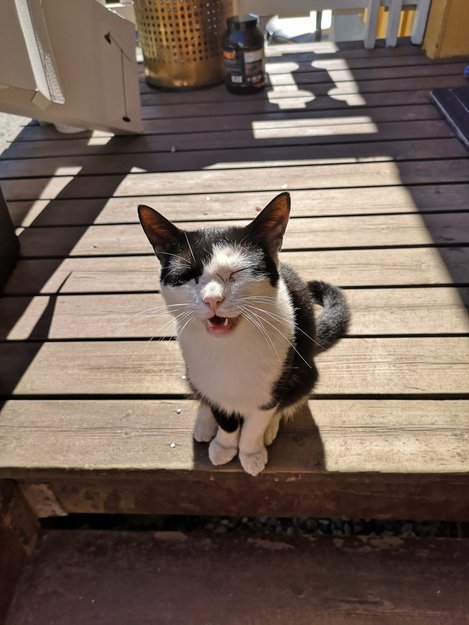 En meget kosete katt befinner seg hos oss. Den har varit hos oss i 3 dagar. Den är helt orädd och kommer in i huset så fort dörren är öppen. Vill kosa och spinner och pratar. Har en egen katt som ikke er lika förtjust över sällskap på gården.