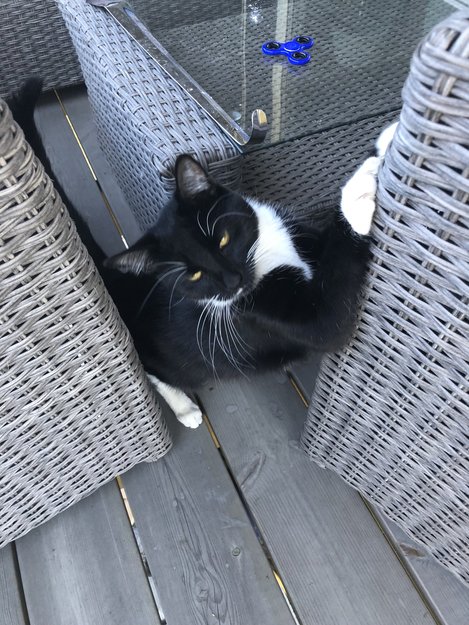 Svart og hvit kattunge som nærmest har bosatt seg til oss siden 6/7-18. Den har fått mat og drikke. Veldig kosete.