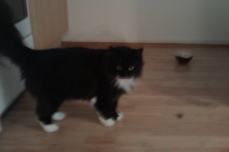 Fra fredagsettermiddag (9.9.11) og utover var denne lille søtingen i hagen min og mjauet, helt til utpå natten. Til slutt hoppet den inn stuevinduet mitt, og med mitt dyregode sinn klarte jeg ikke hive den ut igjen i striregnet. Katten var veldig tynn og mjauet nesten konstant. Jeg ga den litt og spise, og ettertid har den bare ville kommet tilbake. Jeg har prøvd å la den gå uten mat over en dag, og "hivd den ut" kontinuerlig, for å se om den gikk hjem igjen. Katten har fått seg litt floker på bryst og mellom bakbein, noe jeg antar er etter en god vandring.