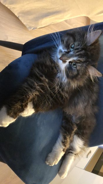 Leken og kosete. Hvit på alle poter og på brystet. Fluffy hale