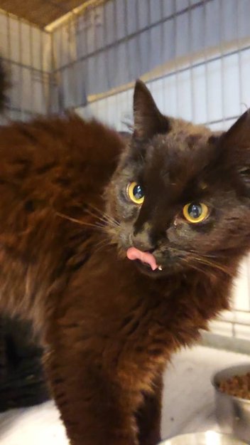 Kastrert hannkatt. Ikke chippet. Hadde flåtthalsbånd på seg, men antagelig gammelt, siden også masse flått.... "Fluffy" korthåret, evt semilanghåret. Svart men med brunskjær i pelsen.