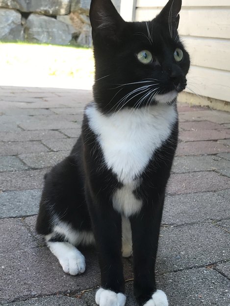 Nydelige, kjærlige hannkatt, svart m. hvit ca. 1 år,kastrert